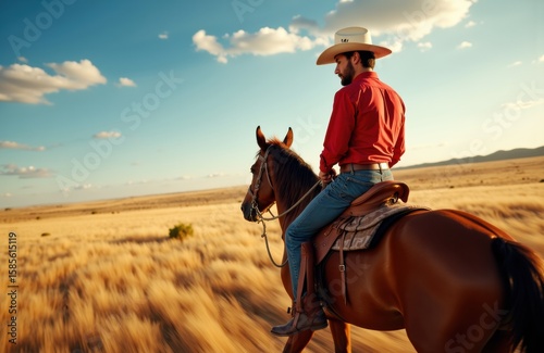 A man riding a horse through open plains under a bright sky with scattered clouds