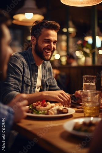 A man sitting at a table with a plate of food. Suitable for restaurant or food-related concepts