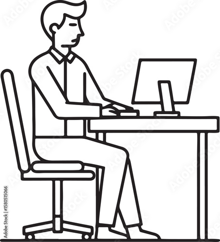 a man sitting on an office chair, working at a computer desk line art, black outline, vector and illustration, coloring book page line art drawing
