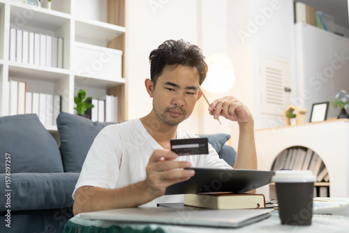 A man spends his vacation paying bills with his laptop, coffee cups and credit cards, and he is looking for a moment to relax after all this activity. A man spends his vacation paying bills with his