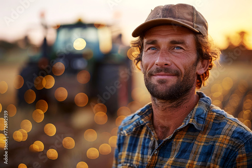 A man standing in front of a tractor in a field. AI generative.