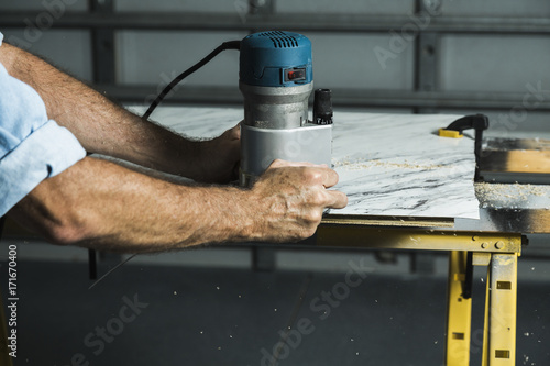 A man using a woodworking router to trim a laminate table top