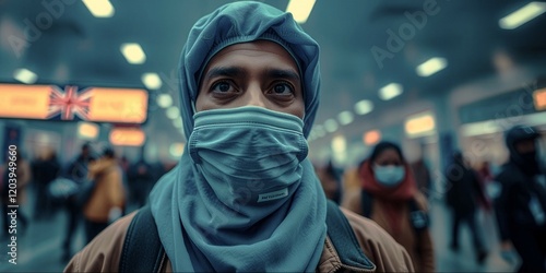 A man wearing a blue scarf and a mask stands in a crowded train station. He is the only person wearing a mask, and he is the only one with a scarf. The train station is busy