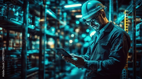 A man wearing a hard hat and glasses is focused on his smartphone while surrounded by shelves filled with supplies in a nighttime warehouse setting