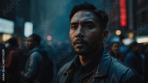 A man wearing a leather jacket stands in a crowded city street at night, with people and illuminated signs around him.