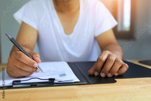 A man wearing a white short-sleeved shirt in comfortable clothes is taking notes at his home office during the COVID-19 pandemic.