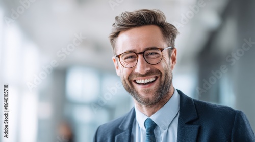 A man wearing glasses and a suit is smiling and looking at the camera. He is happy and confident