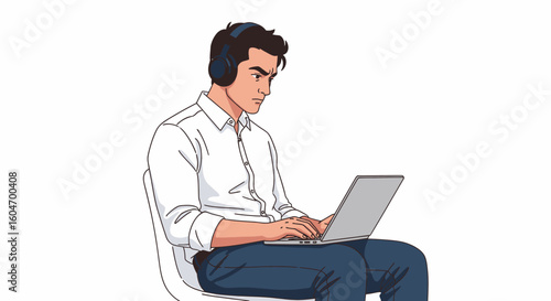 A man wearing headphones intently types on a laptop, focused on his work while sitting.