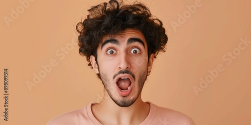 A man with a beard and a mustache is wearing a pink shirt and has his mouth wide open