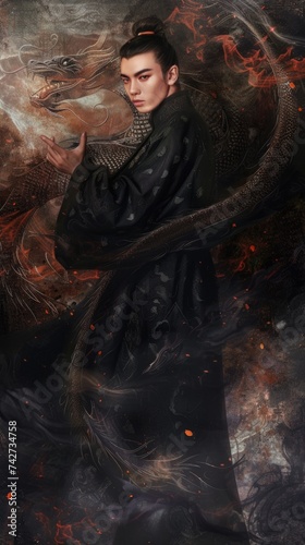 A man with a dragon on his shoulder. Fantasy illustration, immortal realm, fantasy character in ancient China.