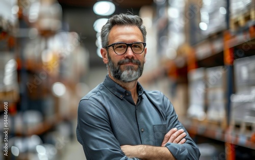 A man with glasses stands in a warehouse with his arms crossed. He is smiling and he is confident