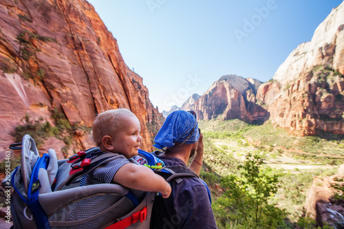 A man with his baby boy are trekking in Zion national park, Utah, USA