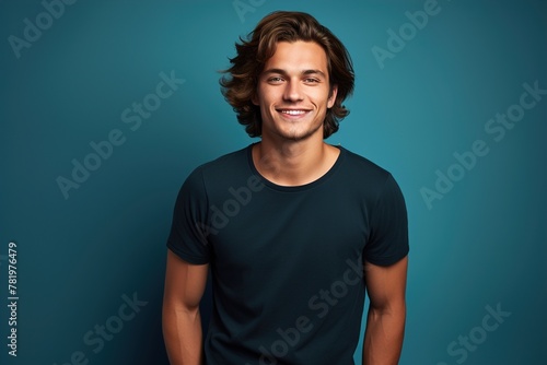 A man with long hair is smiling and wearing a black shirt