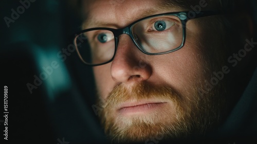 A man's intense focus in digital immersion, glowing softly with unseen connection
