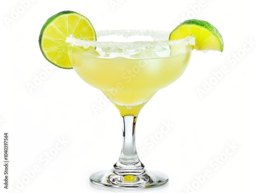 A margarita in a cactus glass with a lime wedge on a white background