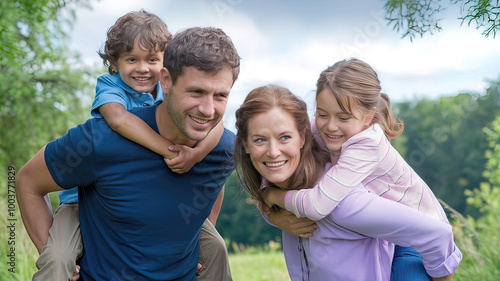 A married couple (husband and wife) ride two small children on their backs, family vacation in nature,