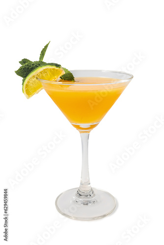 A martini glass filled with a refreshing citrus cocktail garnished with mint leaves and hard liquor.