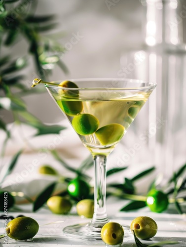 A martini glass filled with green olives on a table, perfect for a cocktail party or advertising a bar