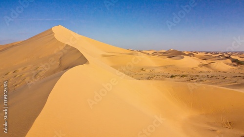 A massive sand dune sits alone in the desert, with minimal vegetation and a clear blue sky