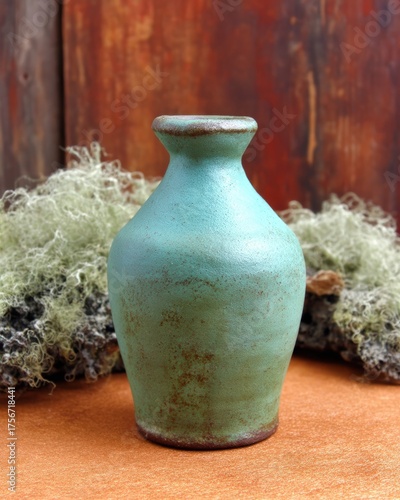 A matte deep teal apothecary bottle rests on warm moss the color of dried rust, with glowing violet lichen and twisted black vines—oceanic depth in a cursed autumn grove—