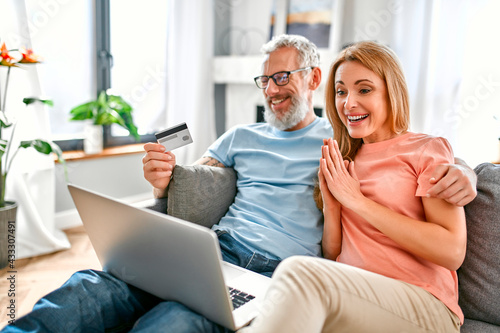 A mature couple is sitting on the couch at home with a laptop and a credit card in hand. Online shopping. Stay home concept.