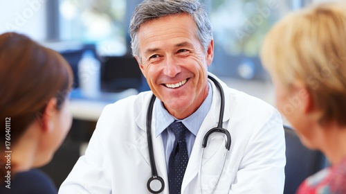 A mature healthcare professional warmly engages with patients during a consultation, conveying trust and reassurance through a genuine smile and attentive demeanor in a clinical setting.