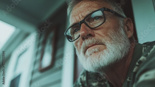 A mature man with glasses wearing a camo outfit looking upward pensively while sitting on a porch, symbolizing introspection and curiosity at home.