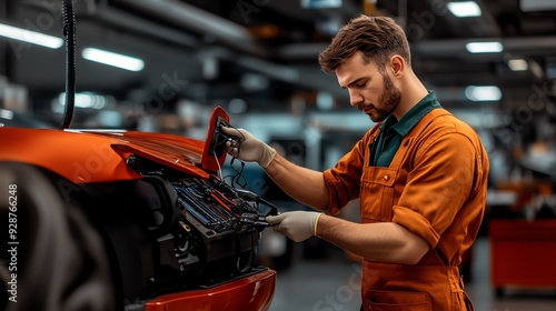 A mechanic working on a car engine, showcasing attention to detail and expertise in automotive repair in a modern workshop.