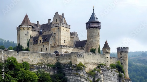 A medieval castle perched on a hill, with a drawbridge and moat