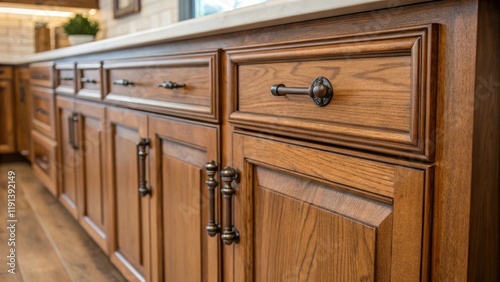 A medium closeup of a traditional wooden cabinet with fresh paint and new hardware emphasizing the contrast between oldworld craftsmanship and contemporary style in a kitchen