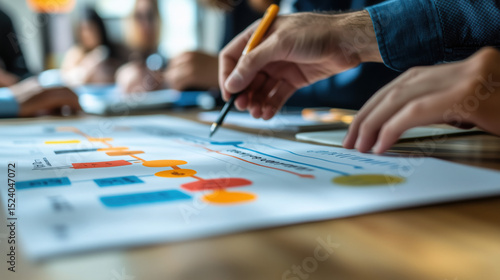 a meeting in progress with employees reviewing a roadmap timeline poster featuring five milestones, startup business setting