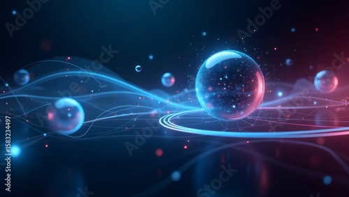 a mesmerizing abstract of glowing spheres and flowing lines, exuding a futuristic and technological aesthetic. The image is alive with bright blue and red light.