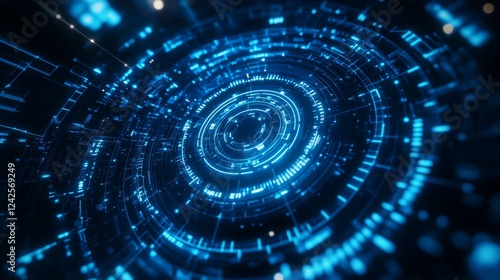 A mesmerizing blue digital vortex with circular patterns and glowing lines, representing technology and innovation in a futuristic design.