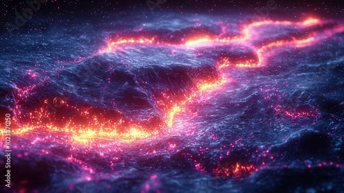 A mesmerizing digital illustration of a lava flow with bright orange and pink glowing elements on a dark background, creating an abstract atmosphere.