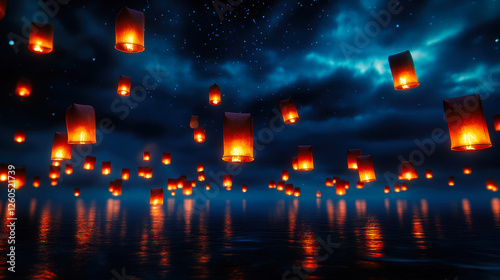 A mesmerizing scene of glowing lanterns floating over dark waters beneath a starry sky, creating a captivating atmosphere of peace and serenity.