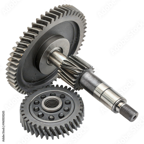 A metal gear shaft assembly with interlocking gears, machine-cut teeth, and precision engineering parts.