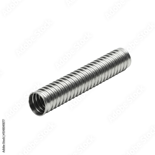 A metallic silver-gray flexible metal conduit (FMC) with corrugated ridges, slightly curved, isolated on a pristine transparent background, soft studio lighting, no shadows, clean product shot concept