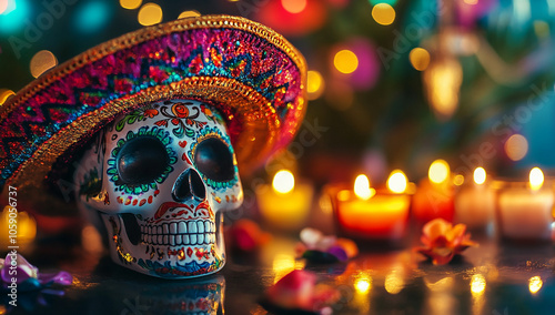 A Mexican Day of the Dead skull wearing a sombrero, with colorful lights, flowers and candles in the background