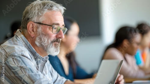 A middle-aged adult participating in a professional development course, engaging with course material and applying it to their current job