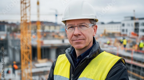 A middle-aged man in a hard hat and safety vest poses confidently at a construction site, showcasing expertise in the building industry amidst ongoing projects.