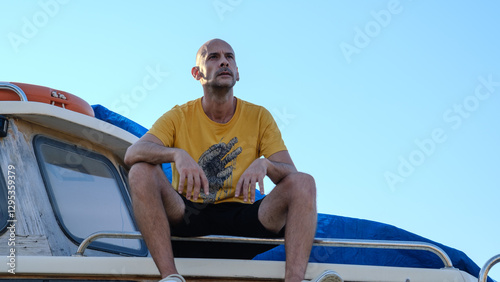 A middle-aged man sitting on the deck of a boat on land on a summer day