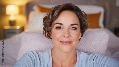 A middle-aged woman stretching in bed with a soft, relaxed smile, surrounded by elegant bedroom decor