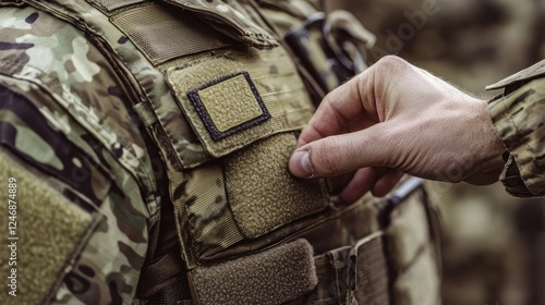 A military uniform with a patch being attached to it using a hook-and-loop fastening system, highlighting its practicality