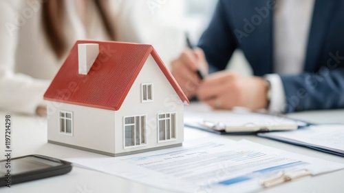 A miniature house model on a table with documents, symbolizing real estate transactions and business discussions.