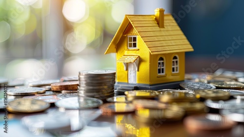 A miniature house model sits atop a stack of coins, symbolizing the concept of buying a home in the new year. Generative AI