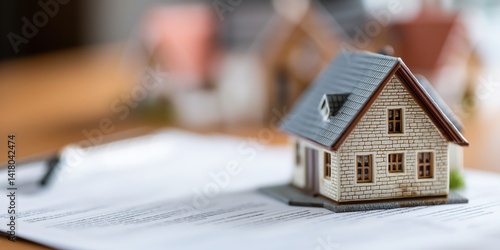 A miniature house model sits atop contract papers, symbolizing the process of purchasing a home and the significant decisions tied to real estate transactions in today’s market.
