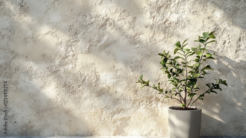 A minimal beige stone wall with a small plant, evoking modern design and simplicity.