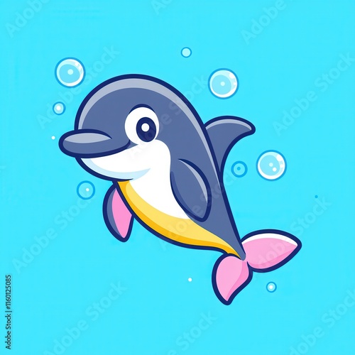 A minimal flat design cartoon vector of a happy dolphin with glowing bubbles, leaping gracefully through a pastel aqua sea, surrounded by sparkles for a calming oceanic design.