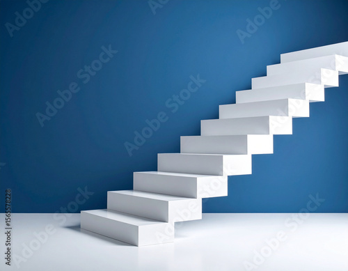 A minimalist 3D rendering of clean white stairs ascending against a solid blue wall, with a white floor extending from the base. Ideal for themes of progress, ascent, modern architecture, or abstract
