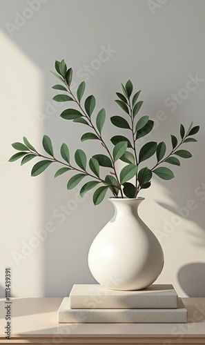 A minimalist arrangement featuring a white vase with green leaves, perfect for home decor, interior design, and lifestyle branding.